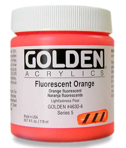 Fluorescent Acrylics Colors are intense, brilliant colors, produced from dyes surrounded by a polymer coating. Because fluorescent colors are so transparent, greater intensity can be achieved by working over a bright white surface. Fluorescent Colors are not lightfast. If a greater permanency is desired, a topcoat of GOLDEN MSA Varnish with UVLS (UltraViolet Light Stabilizers) is recommended, although it will eliminate the fluorescent "glow" under black light. Quarts and gallons are available by special order. Please contact us for rates.