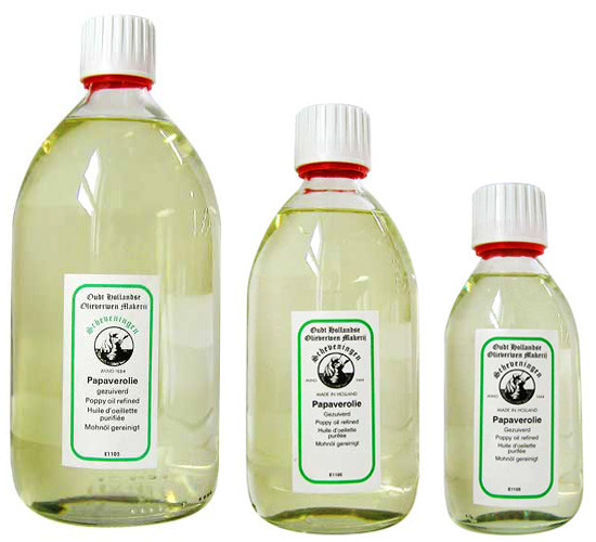 Obtained from the first pressing of poppy oil. Increases the fluidity. Makes it possible to remove the brushstroke. Increases the gloss, but lengthens the drying time. Can be diluted with turpentine and white spirit. Yellows less than linseed oil, but dries slower.